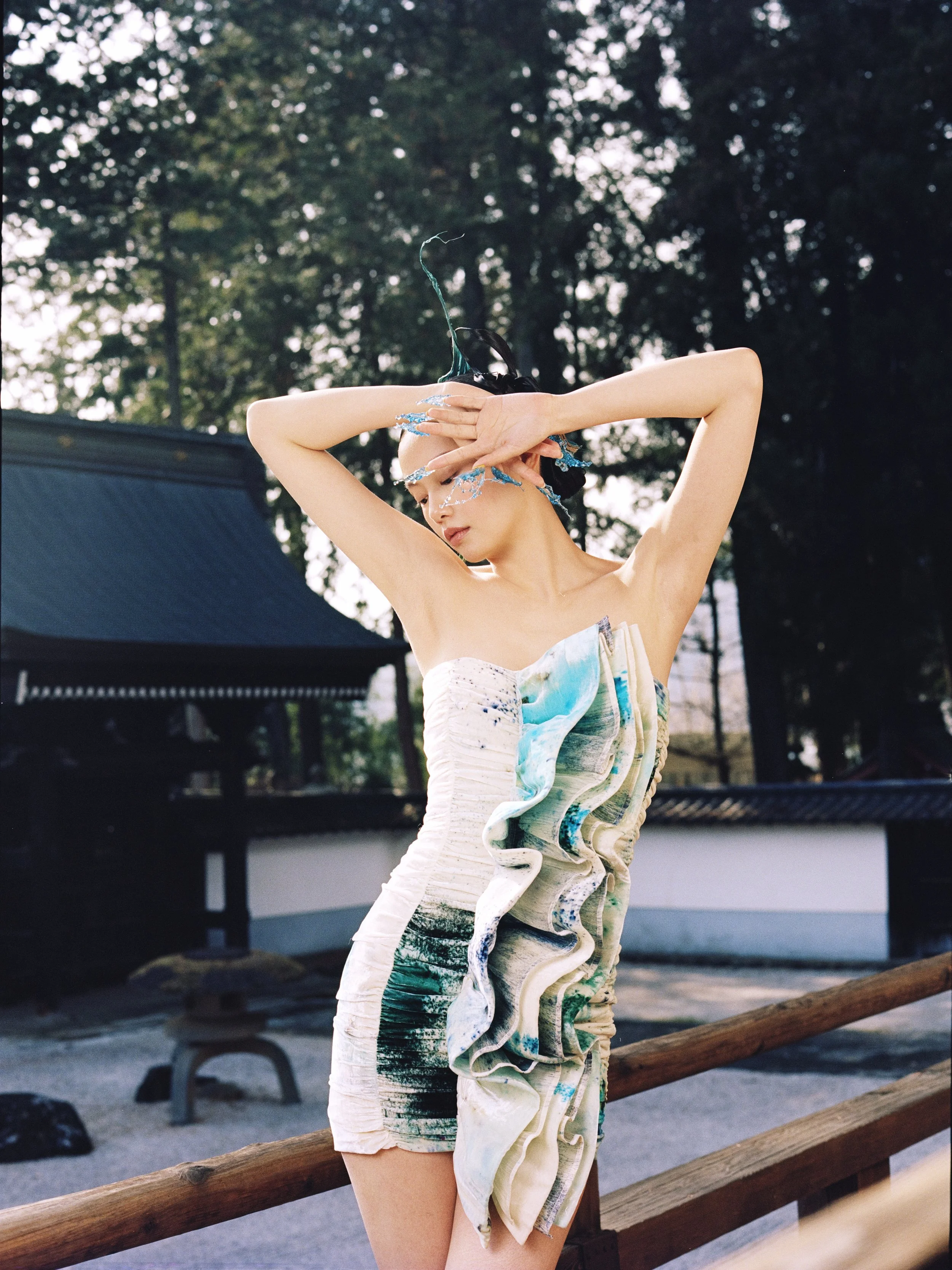 服裝選用純手工植物染與噴繪面料,每一道顏色的流動都是自然的書寫,不規則的漸層如冰川的融化、彩虹的散去。這些不確定性,正是本系列的靈魂所在,美從不靜止,而我們對永恆的渴望,也許是一場溫柔的錯覺。